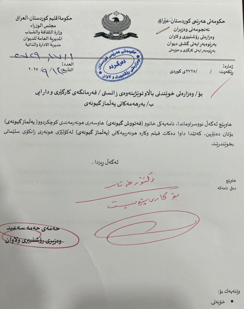 لە ناوەڕۆکی نووسراوێکی فەرمیدا، کە واژۆی حەمەی حەمە سەعید، وەزیری ڕۆشنبیری و لاوانی هەرێمی کوردستانی لەسەرە، ئاماژە بەوە دراوە، خاتوو فەتووش گیونەی، هاوژینی یەڵماز گیونەی، دەرهێنەری کۆچکردوو، داوا دەکات، “فیلم و کارە هونەرییەکانی یەڵماز گیونەی، لە کۆلێژی هونەری زانکۆی سلێمانی بخوێندرێن.”